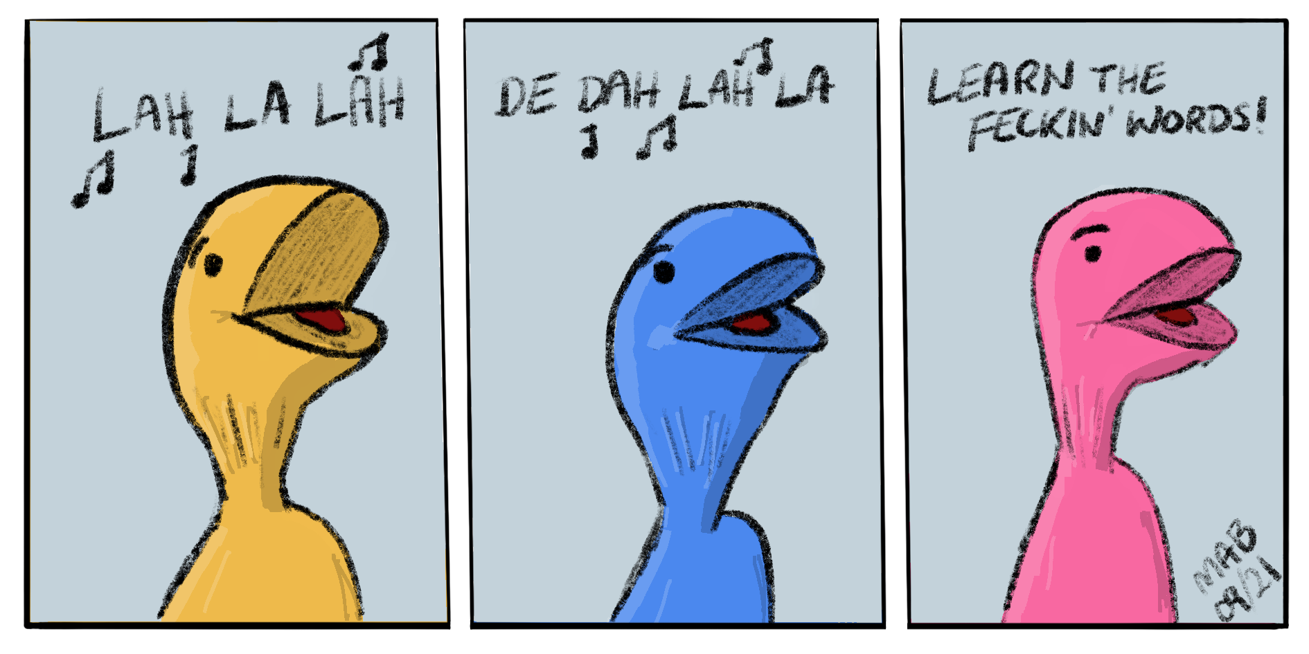 Two shouty sock puppets are singing along, Lah la lah.’ The third exhorts them to learn the words.