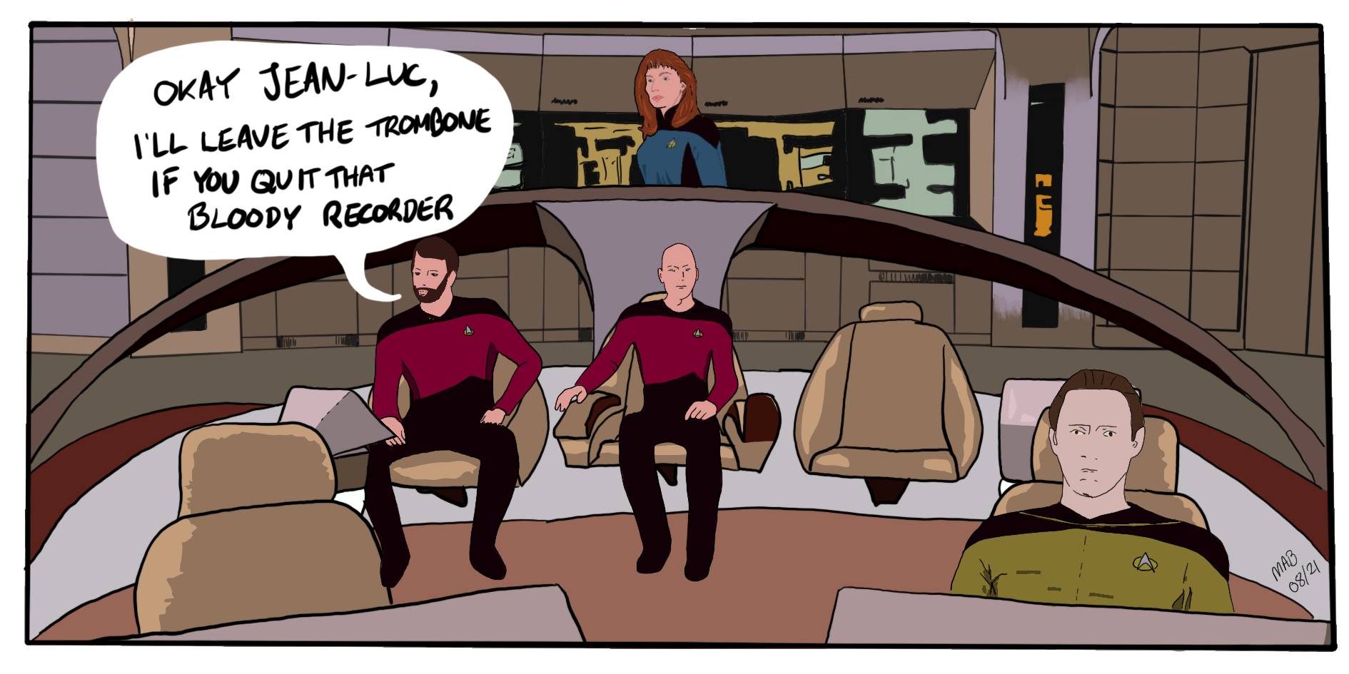 Riker: Okay Jean-Luc, I’ll leave the trombone if you quit that bloody recorder.