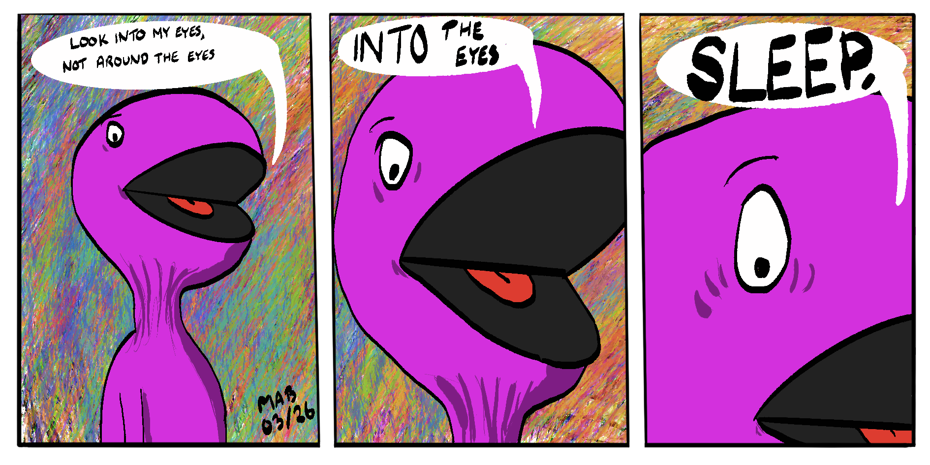 Apr 19 Apr 19 #0035 Murk ComicStrip look into the eyes, not around the eyes, into the eyes…. Sleep Leave a comment